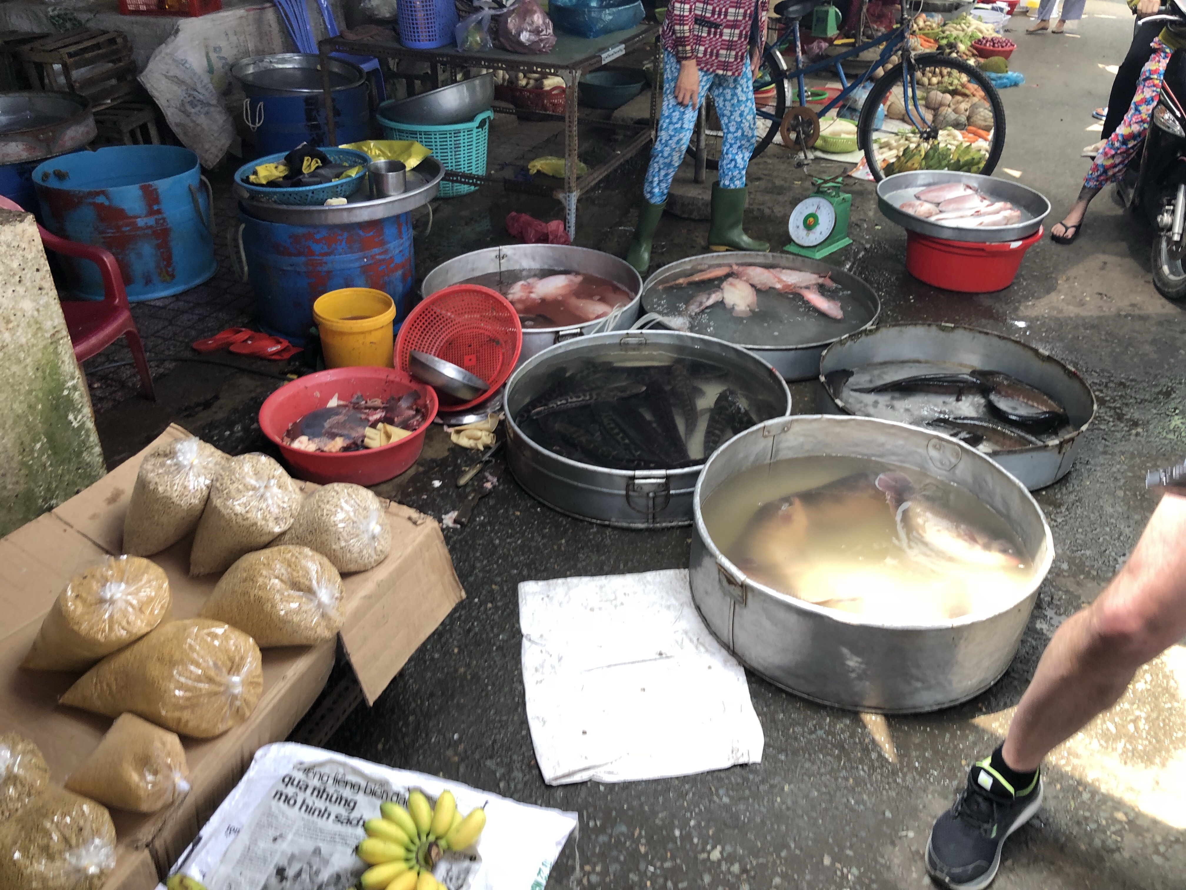 Un petit break pour déguster des fruits tropicaux en écoutant de la musique traditionnelle et nous reprenons le bateau pour aller déjeuner. Un poisson « oreille d’éléphant » grillé, une soupe et un bol de riz plus tard, nous partons visiter une fabrique de riz soufflé, bonbons de coco et autres crêpes de riz et alcool de serpent (pas mauvais)…